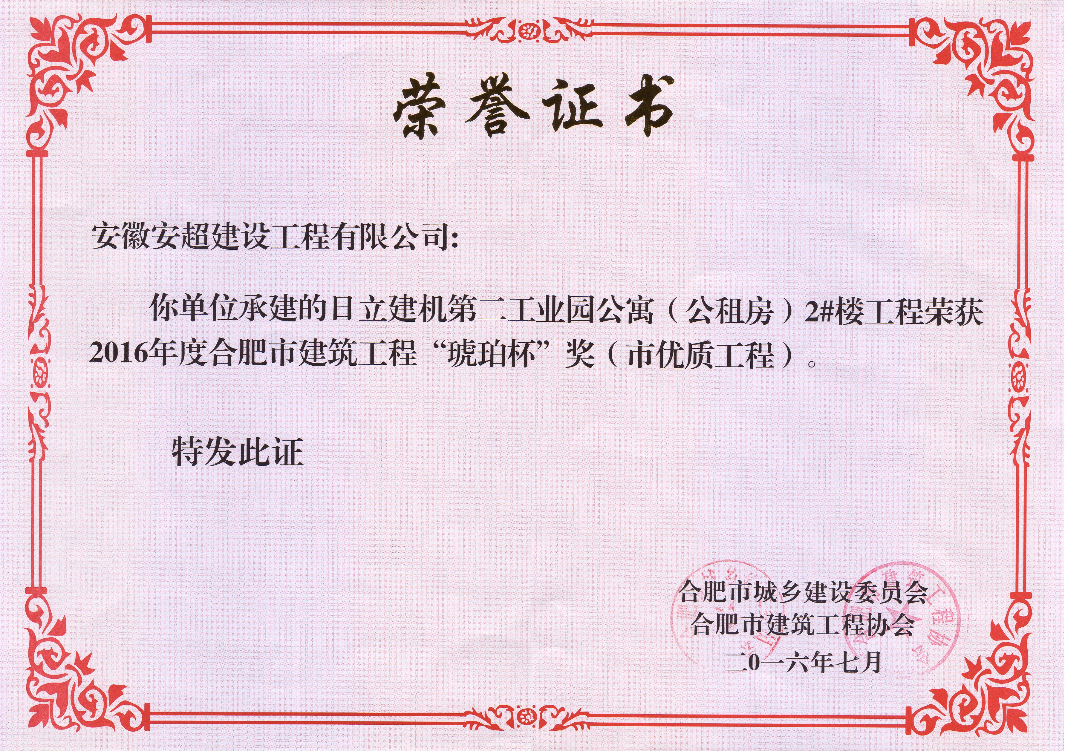 日立建機(jī)第二工業(yè)園公寓2#樓工程榮獲2016年度合肥市建筑工程“琥珀杯”獎(jiǎng)